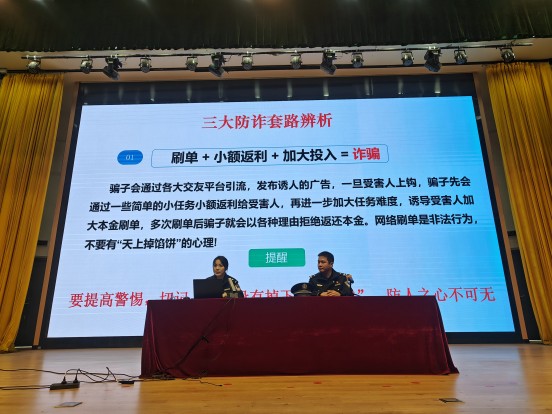 本次講座圍繞三個方面展開,一是結合案例詳細介紹了電信網絡詐騙慣用的手段、途徑,分析了受害人的心理活動和思維邏輯,提醒各位同學要提高警惕,不輕信來歷不明的電話、信息;對詐騙人的花言巧語、危言恐嚇“不聽信、不轉賬、不匯款”;遇到可疑情況及時撥打報警電話,謹防上當受騙。二是提醒學生不要為貪圖小利對外出租、出售、出借銀行卡、電話卡及各種互聯網賬號,保護好個人信息,避免成為電信網絡詐騙犯罪活動的“工具人”。三是總結防范“電信詐騙” 牢記十個“凡是”,提高學生防詐騙的意識。
