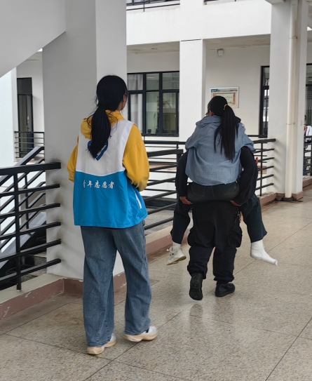 該考生因傷坐輪椅入校,看著在崇教樓四樓的考室心里犯了難。保安崔心銜和徐建林看見了主動上前伸出援手,在征得同意后,背起考生上了五樓。又在考試結束后將其背著下樓。這一舉動不僅體現了學校對考生的關心和支持,更展示了學校始終貫徹服務育人理念,堅持德育工作走深走實。