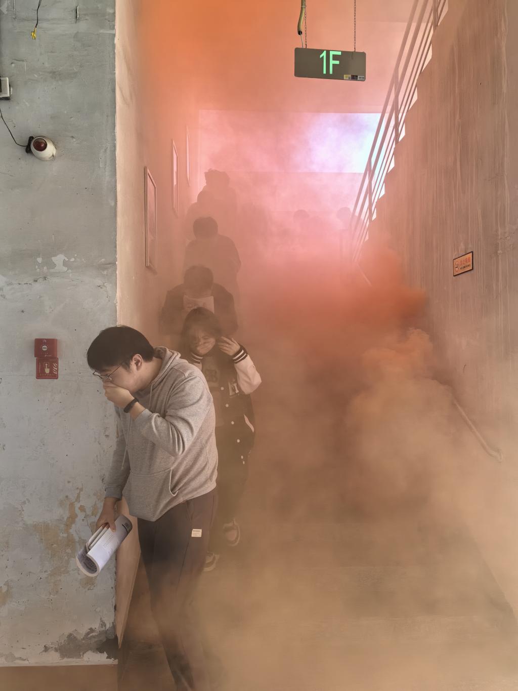 第二部分應急逃生演練(消防、地震)。演練開啟前安全工作處林澤文先詳細介紹消防器材的使用、演練程序、疏散信號、疏散路線、疏散順序等注意事項,并強調在疏散過程中切勿擁擠、推搡導致踩踏事件發生。演練工作組接到演練指令后,燃放煙霧,平靜的醫工學院樓突然黃煙四起、警報鈴響,各位老師迅速到達指定崗位,學生們也隨之做出反應,在現場人員的指揮下,學生們紛紛用手、濕紙巾等捂住口鼻,彎著腰從預定的逃生路線進行撤離,撤退中所有同學緊靠右行,撤退過程井然有序,參加本次演練師生全部安全撤離到指定區域。