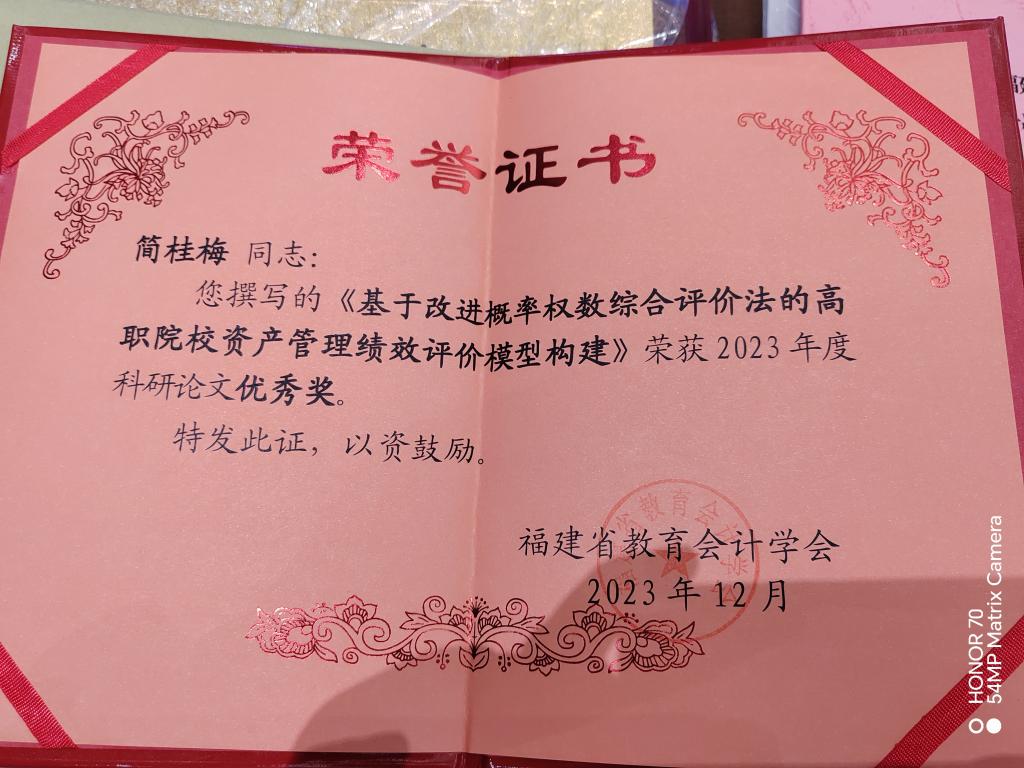 近日,福建省教育會(huì)計(jì)學(xué)會(huì)對(duì)全省高校財(cái)務(wù)工作先進(jìn)單位及個(gè)人進(jìn)行了表彰。我校財(cái)務(wù)處獲得“2022-2023年度學(xué)會(huì)工作先進(jìn)財(cái)會(huì)單位”稱(chēng)號(hào),財(cái)務(wù)處簡(jiǎn)桂梅同志撰寫(xiě)的《基于改進(jìn)概率權(quán)數(shù)綜合評(píng)價(jià)法的高職院校資產(chǎn)管理績(jī)效評(píng)價(jià)模型構(gòu)建》榮獲2023年度科研論文優(yōu)秀獎(jiǎng)。