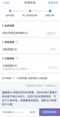 1.稅款計算后,查看應補稅款,點擊“享受免申報”。