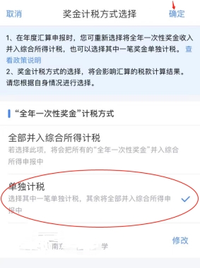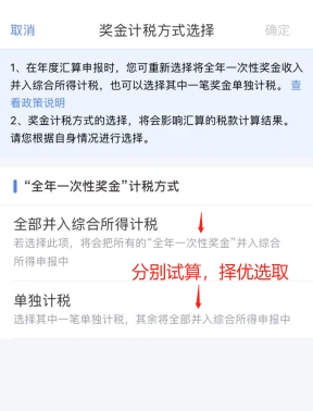 點擊“工資薪金”-“全年一次性獎金”計稅方式有“全部并入綜合所得計稅”和“單獨計稅”兩種,可以分別試算后,選最優方式。