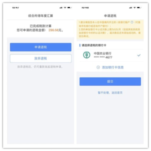 (七)以上所有數據確認無誤后,點“下一步”,完成稅款計算,可查看退稅金額,點擊“申請退稅”,并選擇退稅銀行卡。