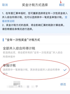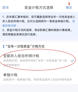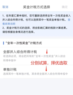 點擊“工資薪金”-“全年一次性獎金”計稅方式有“全部并入綜合所得計稅”和“單獨計稅”兩種,可以分別試算,選最優方式。