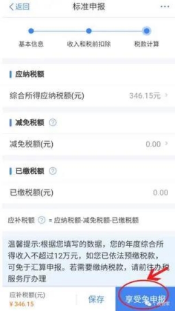 1.稅款計算后,查看應補稅款,點擊“享受免申報”。