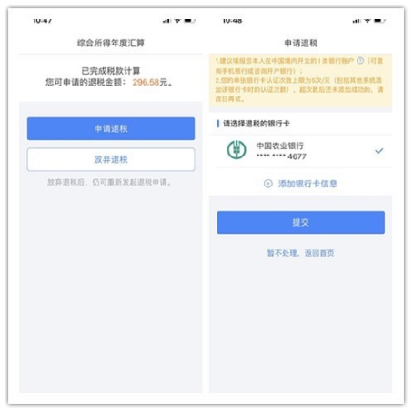 (七)完成稅款計算后,可查看退稅金額,點擊“申請退稅”,并選擇退稅銀行卡。
