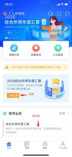 (一)打開并登陸“個人所得稅”APP,點擊“2020綜合所得年度匯算”或“常用業務”下的“綜合所得年度匯算”。