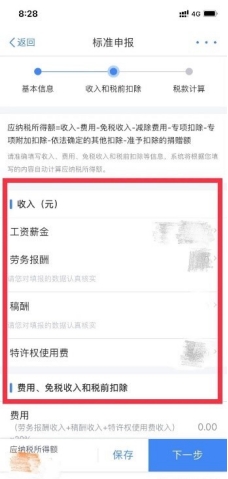 (六)查看“收入和稅前扣除”信息,包括工資薪金、勞務報酬、稿酬和特許權使用費,點擊最后的箭頭可查看每種收入的明細。確認無誤后點擊“下一步”。