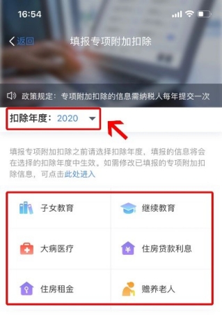 第二步:選擇扣除年度“2020”,再選擇需要填寫或修改的專項附加扣除。