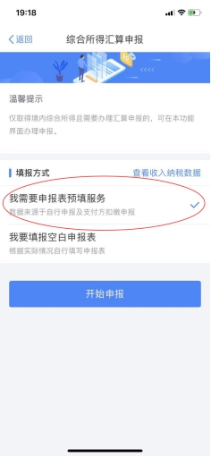 (三)選擇填報方式,建議選擇“我需要申報表預填服務”→“開始申報”,可快速進行申報。
