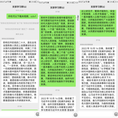 在喜迎黨的二十大勝利召開之際,為深入學(xué)習(xí)貫徹習(xí)近平新時(shí)代中國(guó)特色社會(huì)主義思想,財(cái)務(wù)處全體黨員10月15日晚在家中觀看了CCTV1《黨課開講啦》節(jié)目中,外交部部長(zhǎng)助理華春瑩同志講授的《學(xué)習(xí)貫徹習(xí)近平外交思想,塑造新時(shí)代大國(guó)外交風(fēng)范》專題黨課。