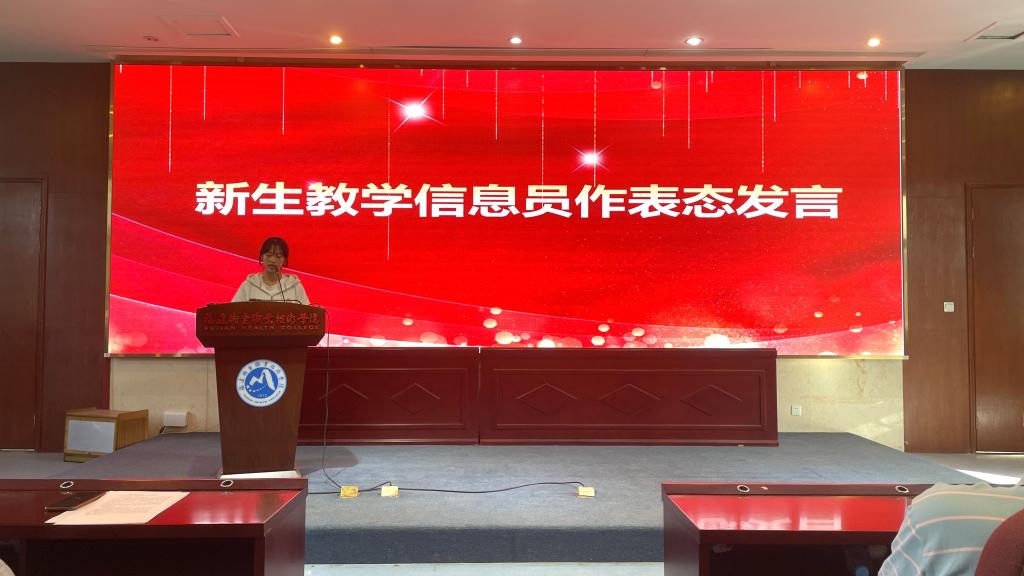 新生學(xué)生信息員代表林晨芳發(fā)表表態(tài)發(fā)言,她代表新生學(xué)生信息員表態(tài)將盡職盡責(zé),認(rèn)真履行信息員的職責(zé),積極參與教學(xué)管理工作,為提高教學(xué)質(zhì)量貢獻(xiàn)自己的力量。