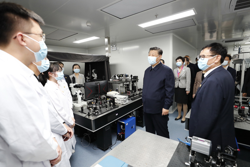 4月19日,在清華大學(xué)建校110周年校慶日即將來臨之際,中共中央總書記、國家主席、中央軍委主席習(xí)近平來到清華大學(xué)考察。這是習(xí)近平在清華大學(xué)成像與智能技術(shù)實驗室同師生們親切交談。新華社記者 黃敬文 攝