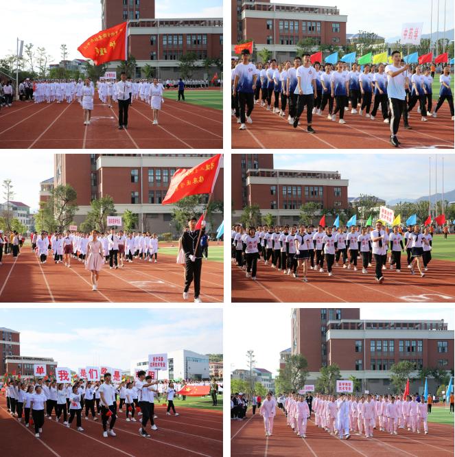 上午8時,伴隨著激昂奮進的《運動員進行曲》,國旗、校旗護旗隊邁著堅定有力的步伐率先入場,經過主席臺接受檢閱;牌隊、彩旗隊、花隊、氣球隊、裁判員方陣緊隨其后,精神抖擻,英姿颯爽;各系運動員代表隊方陣依次入場,整齊的隊伍、響亮的口號、充滿創意的入場方式展現了我校師生們朝氣蓬勃、昂揚向上的精神風貌。