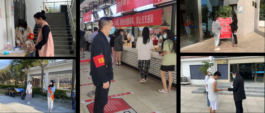 做好督導宣傳,穩定校內秩序。院直機關黨員同志們在食堂、快遞驛站、超市等校內人流量大的區域迅速集結,主動開展黨員志愿服務,積極投入到秩序維護、防疫督導等各項工作中;各院系黨員突擊隊深入學生宿舍,進行線上教學督查;深入學生服務中心、圖書館等場所,督導學生規范佩戴口罩,嚴格執行校內防疫制度。各級黨組織凝聚力量,共同努力,充分發揮“一名黨員一面旗”的作用。