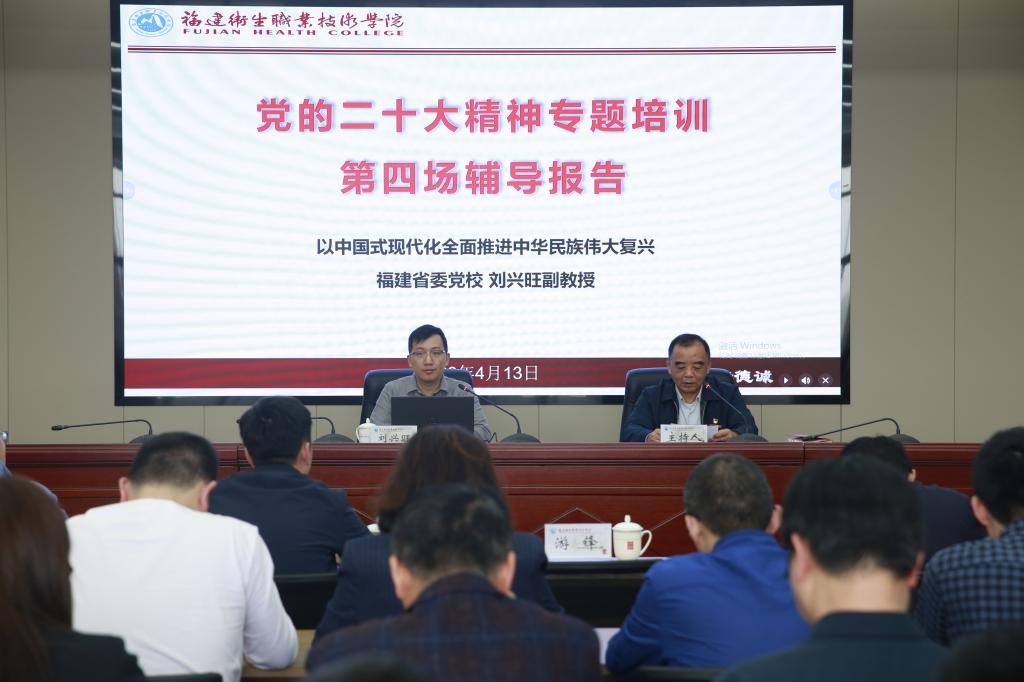 為深入學習宣傳貫徹黨的二十大精神,4月13日下午,我校舉行黨的二十大精神專題培訓第四次集中學習,邀請福建省委黨校劉興旺副教授作輔導報告。校領導、中層干部、專職組織員和師生黨支部書記等共80余人參加培訓。報告會由紀委書記游鋒主持。