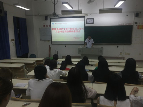 為迎接和學習宣傳貫徹黨的十九大精神,充分的學習到深刻領會習近平總書記回信的精神實質和豐富內涵,堅定理想信念,錘煉意志品質。2017年9月12日,管理系團總支書記邱麟老師組織總支委員會議,組織學習了習近平總書記給第三屆中國“互聯網+”大學生創新創業大賽“青年紅色筑夢之旅”的大學生的回信,通知安排管理系團總支四位學生委員走進2016級四個班級進行深入學習宣傳貫徹習近平總書記的回信精神。