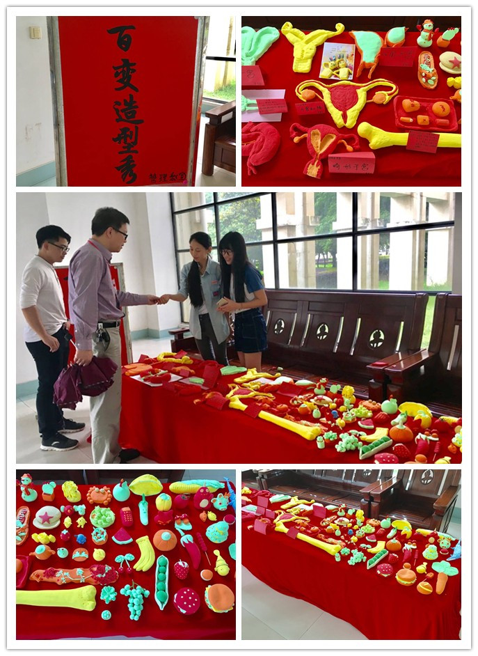 為迎接學院105周年校慶紀念日,管理系同學在聶小鳳和揭金花老師的指導下,結合自己專業特色用橡皮泥捏出不一樣的造型。首先展示的是各種的子宮模型,畸形子宮、縱膈子宮、雙角子宮等;作為專業主場,預防醫學專業展示了心、肝、肺、胃、胰腺、大腸、手骨、股骨等模型,讓我們對人體內臟有了更為直觀的感受;而體育保健、營養專業的同學也不示弱,南瓜,豆角、玉米、楊桃、葡萄、甚至漢堡也上線,他們堅信更好的膳食、更強壯的體魄才能有更好的健康。作為管理系獨具特色的醫學美容技術專業和衛生信息管理專業,除了通過畢業成果設計展和電腦維修服務來為自己加分,他們也參與到其中,精致的晚禮服、手工版SKII和呆萌的卡通都是他們對美的感悟。