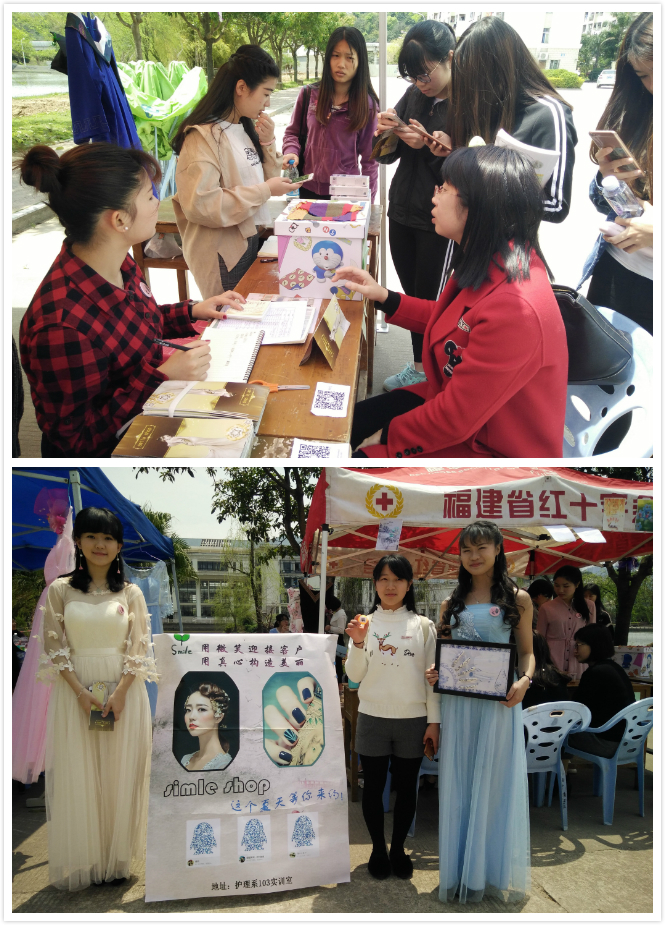 Smile shop是由醫學美容專業學生自主創辦的創業項目。在創辦初期得到學校領導的大力支持,現今已創辦2年之久。項目以生活美容為主,如護膚(臉部按摩護理,)美體(腎部保養,腹部減肥)美甲(光療甲)美妝(舞臺妝,生活妝,攝影妝等),還有醫美項目,冰點脫毛,激光點痣,紅藍光治療儀等。創辦此項目的目的是為了體現醫美專業學生的價值,將課堂學到的美容手法與技能,應用到實際生活中。使大家更多的了解美容這個行業,也讓我們的生活變得更加的豐富。