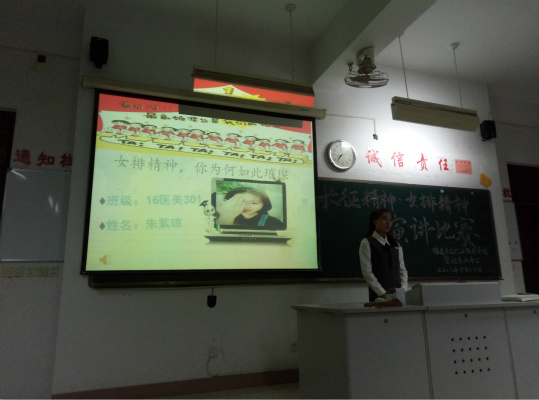 為傳承長征精神與奧運女排的拼搏精神,營造良好的校園文化氛圍。10月30日晚7點管理系學生會在教學樓209教室舉辦以“自強不息,百折不撓”為主題的演講比賽,9名選手參賽。