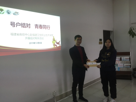 2019年12月6日上午,福建省疾病預防控制中心病毒科“青年文明號”創建小組到健康管理系開展“號戶結對青春同行”資助活動,省疾控中心傳染病防治所副書記、病毒科科長翁育偉,中心黨辦副主任、團委書記黃萌,病毒科青年文明號號手張炎華,健康管理系莊海林主任,健康管理系黨總支艾松軍書記,預防醫學教研室揭金花老師、李丹老師,輔導員趙茜老師及受資助的18預防301班廖佳雨同學參加本次活動,活動由艾松軍書記主持。