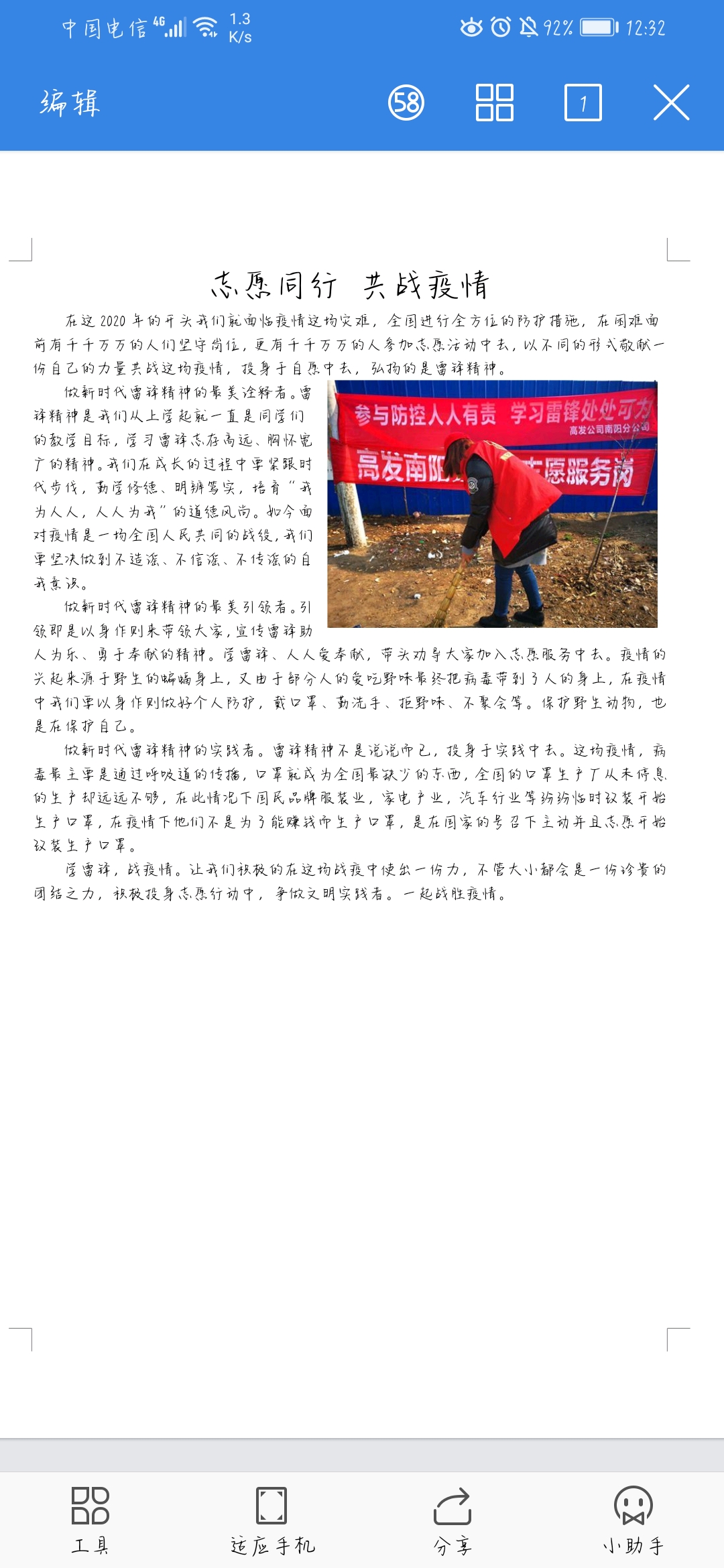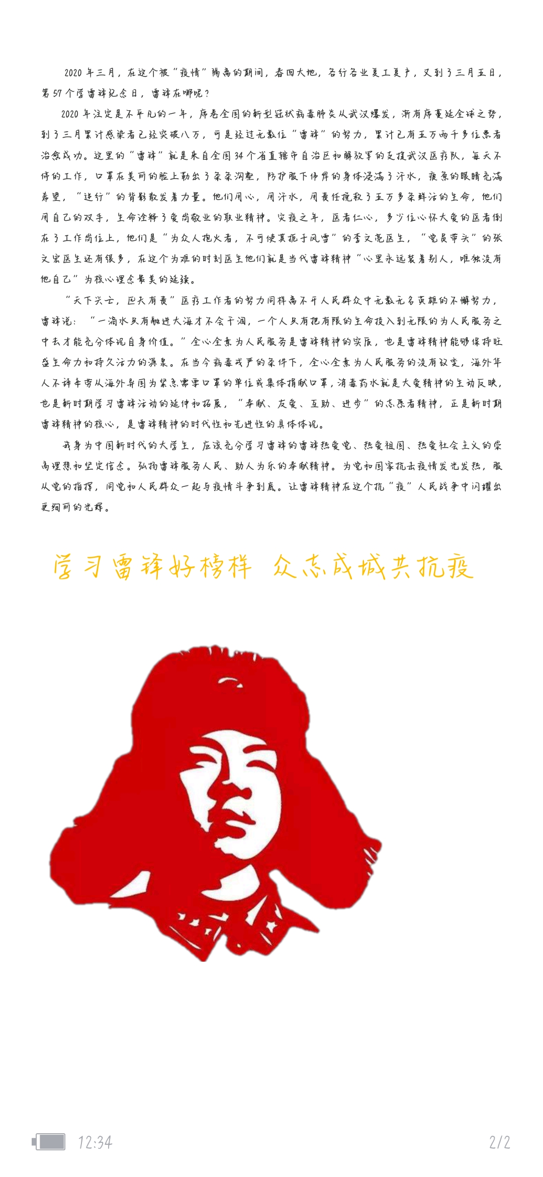 通過此次線上征文比賽使同學們認識到抗擊疫情需要全社會的共同參與,雷鋒精神是中國精神的突出代表,面對突然而來的疫情,作為一名大學生,我們將傳承雷鋒精神,凝聚起全面抗擊疫情的重要力量,奏響抗疫最強音!