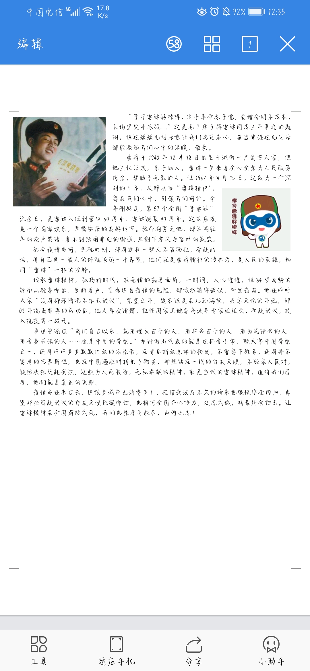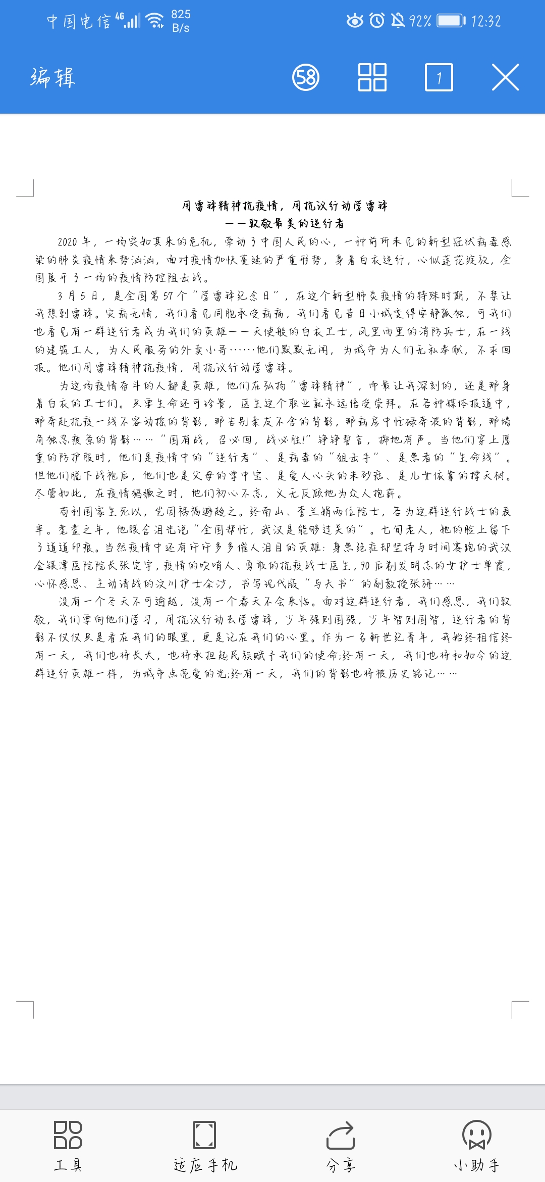 傳承雷鋒精神,弘揚時代新風。為深入學習社會主義核心價值觀,推動文明校園建設,提升學生道德水平,我系易班于2020年3月15日開展以 “學雷鋒,奮筆書寫心悟”為主題的網上征文比賽,旨在以優秀文學作品凝聚大愛,凝聚民心,鼓舞士氣,團結引領大家齊心協力戰勝疫情。各班易班班長充分認識到此活動的重要意義,認真落實了活動方案,確保此次活動順利開展。