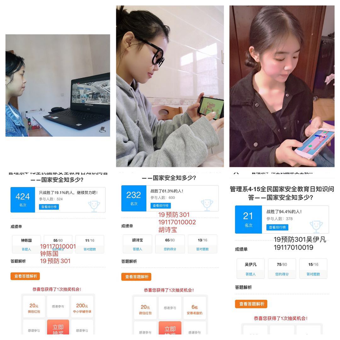 同時,為了營造“停課不停學”的學習氛圍,我系各團支部與班級保衛委員以QQ、微信等為載體,通過觀看相關視頻和“全民國家安全教育”知識問卷形式更全面的引領同學們了解國家安全,為師生提前打下國家安全“預防針”。通過視頻和問卷調查,同學們也認識到隨著經濟全球化和信息網絡化進程的不斷推進,我們要注重國家安全意識的培養,增強國家安全觀念已經日益成為學生素質教育中的一個重要方面。