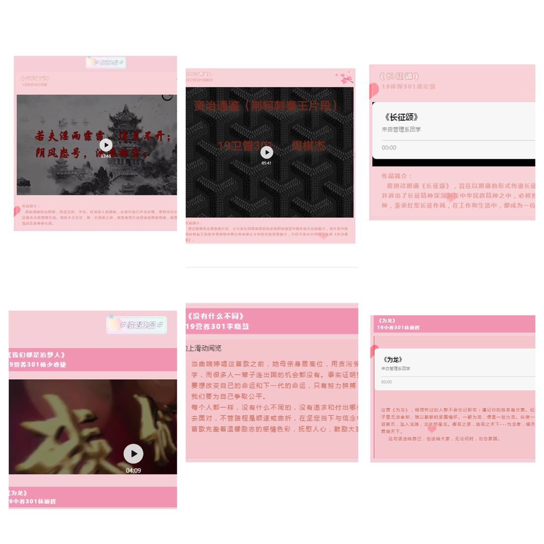 本次線上活動主要分為朗誦和歌唱兩種形式,活動受到了同學們的廣泛關注。在活動過程中,一句句慷慨激昂,氣勢恢宏的朗誦充分體現了當代大學生的青春與活力;一首首耳熟能詳、熱血澎湃的歌唱充分展示了我系學子樂觀向上、積極奮進的昂揚斗志。在這個五四青年節的來臨之際,一群意氣風發的青年者用青春描繪時代的畫卷,唱響時代的凱歌,揚起時代的風帆,更是營造了一種樸實深情、唱響新時代的主旋律的良好氛圍,謳歌了青年學子們對中華千古風韻與歷史遺產的精神面貌。以歌聲傳遞信仰、用朗誦傳承經典,每一句詩韻和歌唱都深深表現出我系學子們對中華經典的熾熱追求與敬佩。最終,(1)朗誦榜:16美容501鄭霏《岳陽樓記》,19衛管301周棋杰《資治通鑒》,19體保301龔宏祺《長征頌》,19預防302張小龍《日出東方》,19中醫養生保健301曾余熙《大醫精誠》;(2)歌唱榜:19中養301林麗輝《為龍》,19營養301李婷婷《仰望星空》,19營養301李曉慧《沒有什么不同》,19營養301李夢婷《陽光總在風雨后》,19營養301楊少睿捷《我們都是追夢人》作品脫穎而出。