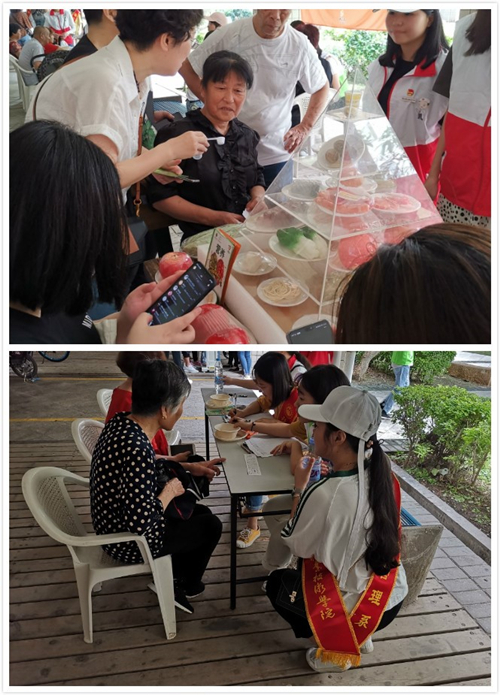 為了強化對社區居民日常膳食的指導,此次活動還進行了有獎互動環節及營養調查環節。有獎環節,參與者隨機抽取問題并作答即可獲得精美紀念品。營養調查環節,老師與志愿者們通過與社區居民交流,了解其日常膳食情況,發現問題,并針對實際情況,給予正確的膳食指導。