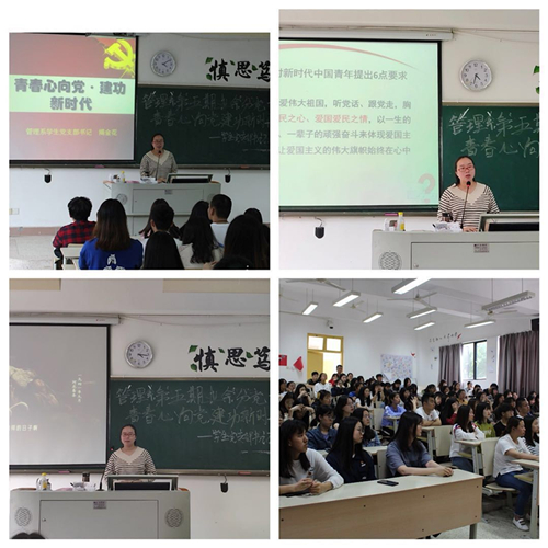 為響應(yīng)黨中央和團(tuán)中央的號(hào)召,繼承和弘揚(yáng)五四精神,管理系學(xué)生黨支部書記揭金花老師借以“紀(jì)念五四運(yùn)動(dòng)一百周年”之際,于5月9日下午在教學(xué)樓211,召開以“青春心向黨,建功新時(shí)代”為主題的管理系第五期業(yè)余分黨校培訓(xùn)班。旨在通過此次分黨校培訓(xùn),讓各位分黨校學(xué)員能更好地發(fā)揚(yáng)“五四精神”,共抒愛國(guó)情懷,進(jìn)一步加強(qiáng)自身思想政治教育工作。