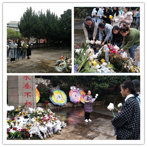 祭掃活動伊始,全體參與人員整齊列隊在革命烈士紀念碑前齊唱國歌后,大家在革命烈士紀念碑前默哀三分鐘,懷著崇高的敬意向革命烈士紀念碑深深地三鞠躬并獻上自制的紙花,隨后,管理系學生黨支部書記揭金花同志代表支部發言,表達了對革命烈士的追念和敬仰,并呼吁我們永遠不能忘記英烈們的付出,更不能忘記我們肩負著實現中華民族偉大復興的歷史重任。希望所有的教師黨員在教育崗位上守土有責、守土負責、守土盡責,教書育人,培養出優秀的大學生。希望所有學生入黨積極分子,努力學習,掌握就業本領,在將來的工作崗位上,為祖國衛生事業發展貢獻力量。