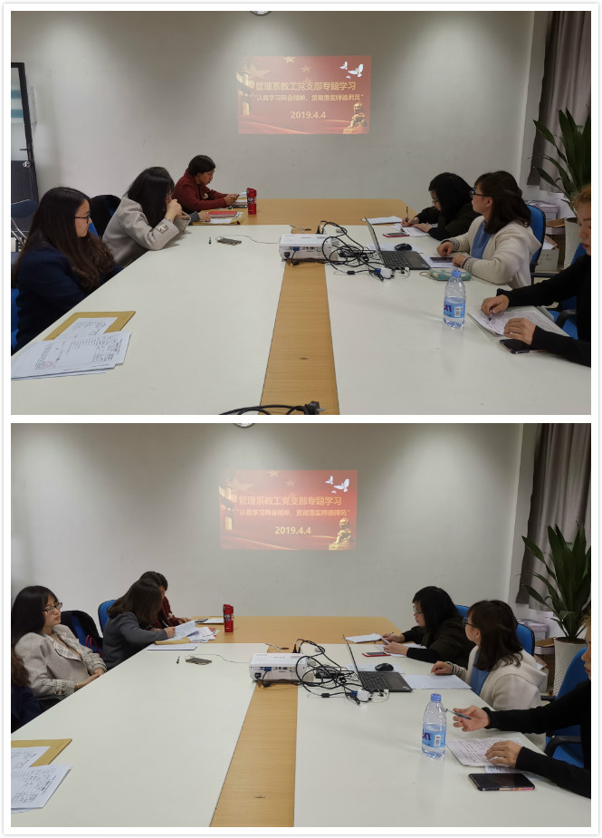 為進一步傳達、學習2019年全國兩會精神,加強系部師德師風建設,管理系教工黨支部舉行“認真學習兩會精神,貫徹落實師德師風建設”專題學習。此次學習由教工黨支部組織委員兼紀檢委員王國浩同志組織。