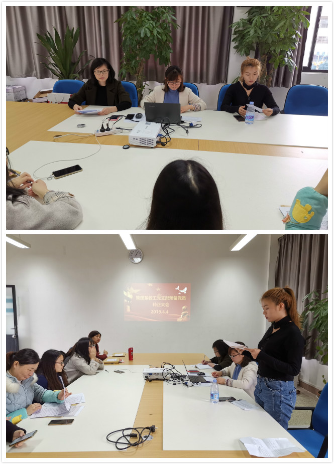 4月4日,管理系教工黨支部舉行預備黨員轉正大會,大會討論并審議預備黨員朱紫瓊(16美容301)同志轉為正式黨員問題,全體支部黨員參加會議。