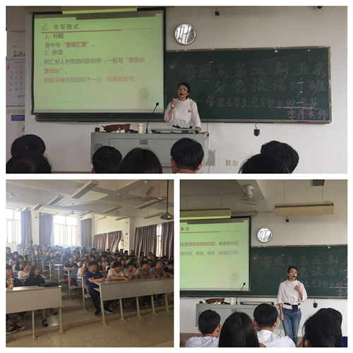 為及時落實同學們階段性思想?yún)R報情況,端正入黨動機,加強黨性修養(yǎng), 2019年4月10日,管理系第五期業(yè)余分黨校第五課于教學樓209開講。本期分黨校培訓班由管理系學生黨支部組織委員李丹老師作為主講人,開展本次“入黨積極分子思想?yún)R報書寫格式及要求”的專題講座,分黨校全體學員到場聆聽。