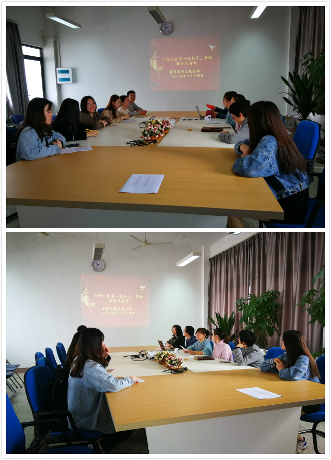 為了深入學習宣傳貫徹習近平新時代中國特色社會主義思想和黨的十九大精神,牢記總書記關于“扣好人生第一粒扣子”的教導,2019年3月14日,管理系教工黨支部開展“扣好人生第一粒扣子,爭做新時代青年”主題黨日活動。此次活動由教工黨支部書記馮瑞華同志主持。