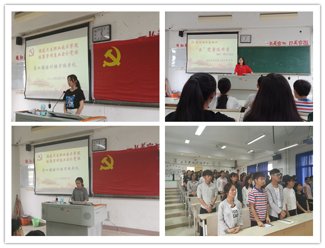 開班儀式在雄壯的《國歌》中拉開帷幕,邱麟老師對全體學員提出了培訓班的具體要求,她要求學員們充分認識黨校學習的重要性,用踏實、扎實、務實的學習,克服本領恐慌,堅持理論聯系實際的良好學風,確保通過本期分黨校培訓,學有所思、學有所悟、學有所感、學有所成。她希望全體學員通過培訓,提升思想境界,提高解決問題的能力,不忘初心,牢記入黨初衷。培訓班學員代表17預防302班團支部吳圣楠同學在發言中表達,新時期賦予青年們機遇和挑戰,作為新時代青年,是國家的希望,是黨的后繼力量,將謹記時代的重托,持之以恒,在實踐中學知識、強理論、長才干、作貢獻,不斷完善和提高自我,為構建和諧美好社會貢獻青春智慧和力量。