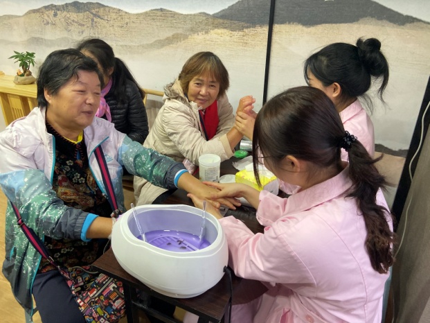 醫學美容教研室吳若云老師、施怡寧老師帶領醫學美容技術專業學生與社區居民零距離接觸,為社區的阿姨進行現場美甲及手部護理蠟療。參與互動的群眾對本次活動的專業度表示極大的認可,對手部護理也有了更新更科學的認識,進一步提高了美學素養。本次活動既增強了居民對健康美容知識和技能的了解,提高了我院醫學美容技術專業的知名度,同時也提高了學生的實踐能力。
