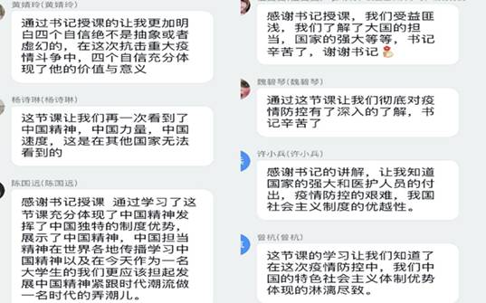 19健管302班陳國遠說,通過學習,我充分認識到了中國特色社會主義制度無可比擬的優勢和中國擔當。作為一名大學生,我們更應該擔起發揚中國精神的大任,勇做時代弄潮兒;19預防301班楊鵬輝說,這節課讓我明白了中國共產黨的堅強領導是抗擊新冠肺炎疫情的根本保證,社會主義能夠集中力量辦大事的制度具有集中人力、物力、財力的優勢,人民群眾團結一心“一方有難八方支援”的眾志成城,明白了這一切都是因為我國社會主義制度的優越性。