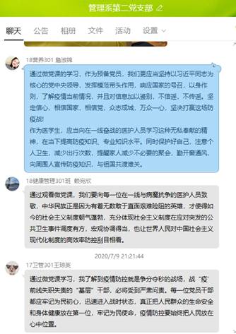 觀看微黨課后,全體黨員通過QQ群分享心得體會。教師黨員邱麟表示:通過微黨課的學(xué)習(xí),體會到共產(chǎn)黨人敢于出擊,敢戰(zhàn)能勝,挺起敢于斗爭的精神脊梁。要切實(shí)增強(qiáng)“四個意識”、堅定“四個自信”、做到“兩個維護(hù)”,把人民群眾生命安全和身體健康放在第一位,把疫情防控工作作為當(dāng)前最重要的工作來抓,同時間賽跑、與病魔較量,爭分奪秒戰(zhàn)疫情,堅決打嬴疫情防控阻擊戰(zhàn)。