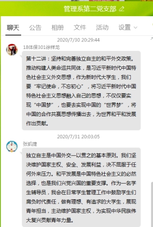 2020年7月30日,管理系第二黨支部借助學習強國平臺學習了“治國理政大家讀”系列第十二講:堅持和完善獨立自主的和平外交政策。黨的十九屆四中全會提出,要堅持和完善獨立自主的和平外交政策,推動構建人類命運共同體。新中國成立后確立了獨立自主的和平外交政策,倡導和平共處五項原則,打破了“國強必霸”、“大國必戰”的西方邏輯。而推動構建人類命運共同體則是在人類歷史發展進程的新高度上,中國外交的重要目標和努力方向。提出必須統籌國內國際兩個大局,高舉和平、發展、合作、共贏旗幟,堅定不移維護國家主權、安全、發展利益,堅定不移維護世界和平、促進共同發展。
