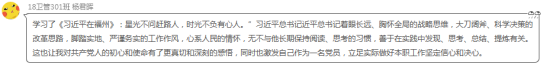 學生黨員楊君暉表示:星光不問趕路人,時光不負有心人。”習近平總書記著眼長遠、胸懷全局的戰(zhàn)略思維,大刀闊斧、科學決策的改革思路,腳踏實地、嚴謹務實的工作作風,心系人民的情懷,讓我對共產(chǎn)黨人的初心和使命有了更真切和深刻的感悟,同時也激發(fā)自己作為一名預備黨員,立足實際做好本職工作堅定信心和決心。