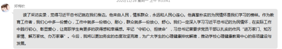 教師黨員鄭梅欽表示,讀了采訪實錄,習近平總書記真摯樸實的為民情懷是我們學習的榜樣。作為教育工作者,我們心中多一份愛心,工作中就多一份細心、耐心,群眾就多一份放心、舒心。深入學習習近平總書記的為民情懷,在實際工作中踐行初心、彰顯愛心,讓高職學生有更多的獲得感和幸福感。