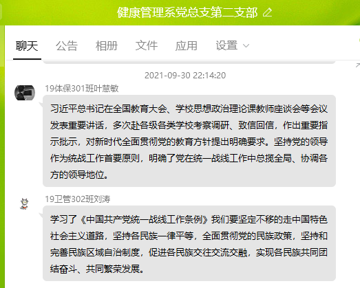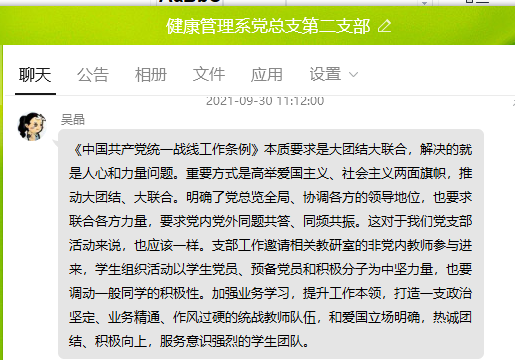教師黨員吳晶同志表示,學習了《中國共產黨統一戰線工作條例》,明確了黨總覽全局,協調各方的領導地位,在支部工作中要充分團結和調動非黨員教師和一般學生的活動積極性。打造一支政治堅定、業務精通、作風過硬的統戰教師隊伍,和愛國立場明確,熱誠團結、積極向上,服務意識強烈的學生團隊。