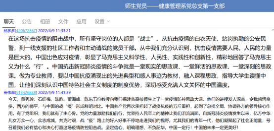 教師黨員邱多多同志表示,在這場抗擊疫情的阻擊戰中,所有堅守崗位的人都是“戰士”。從抗擊疫情的白衣天使、站崗執勤的公安民警,到一線支援的社區工作者和主動請戰的黨員干部。從中我們充分認識到,抗擊疫情需要人民,人民的力量是巨大的。中國出色應對疫情,彰顯了馬克思主義科學性、人民性、實踐性和創新性,精彩地回答了馬克思主義為什么“行”。做為專業教師,我要以中國抗疫涌現出的先進典型和感人事跡為教材,融入課程思政,指導大學生讀懂中國,讓他們深刻認識中國特色社會主義制度的制度優勢,深切感受充滿人文關懷的中國溫度。