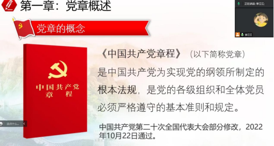 課上,李江江老師詳細講解了《中國共產黨章程》,強調了《中國共產黨章程》是我們黨內的根本大法,是立黨、治黨、管黨的總章程,是加強和規范黨內政治生活的總依據,是黨的各級組織和全體黨員必須遵循的總規矩。《中國共產黨章程》體現了黨的十九大以來黨的理論創新、實踐創新、制度創新成果,體現了黨的二十大報告確定的重要思想、重要觀點、重大戰略、重大舉措,對堅持和加強黨的全面領導、堅定不移推進全面從嚴治黨、堅持和完善黨的建設、推進黨的自我革命提出了明確要求。黨員學習《中國共產黨章程》對于加強黨性修養、堅定理想信念、弘揚優良作風具有重大意義。