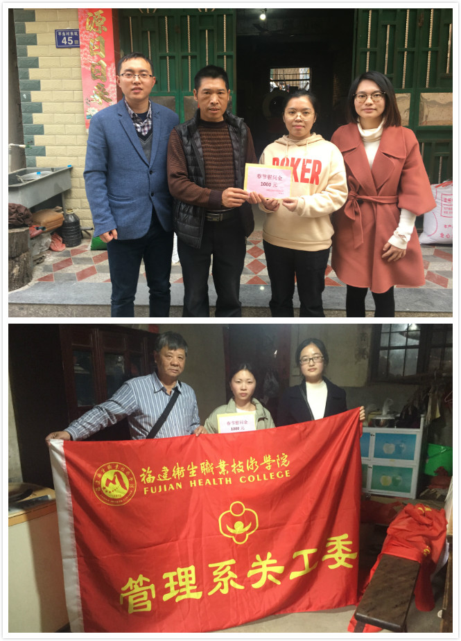 為貫徹落實高校家庭經濟困難學生資助政策,關心貧困大學生的成長與發展。1月26-27日,管理系組織關工委領導、教師代表、輔導員赴閩侯縣洋里鄉,漳州市華安縣開展“迎新春,送溫暖”慰問貧困生活動,為貧困學生家庭送上慰問金和慰問品,以及節日的祝福。讓貧困學生和家長感受來自衛職院大家庭的溫暖。