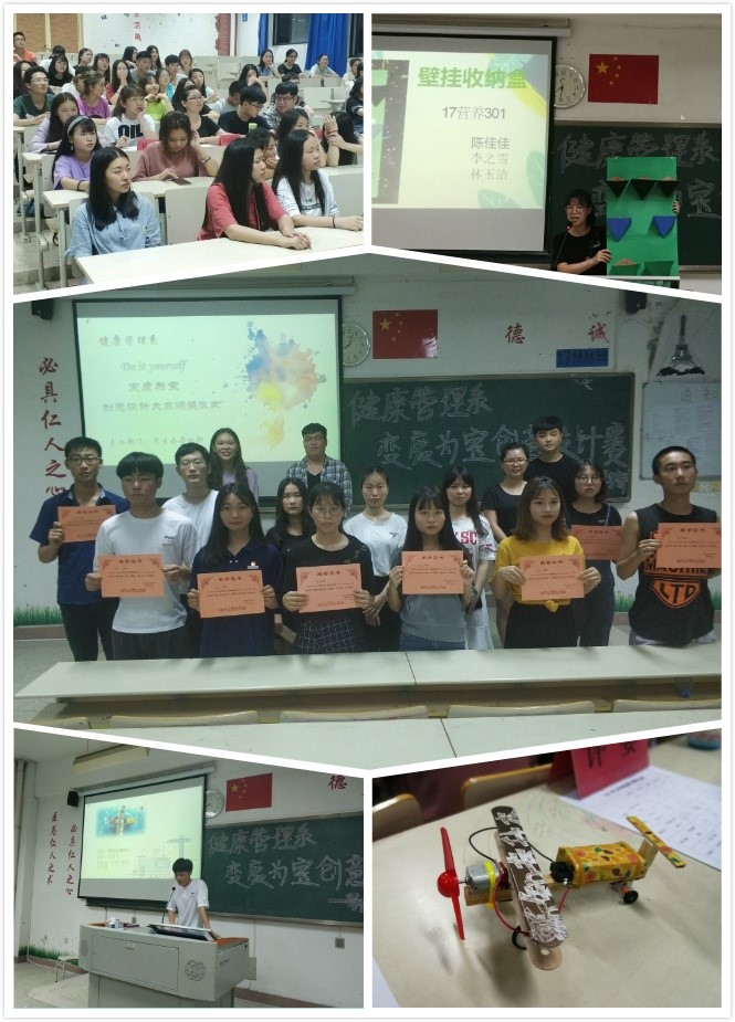 為響應黨的十九大關于大力推進生態文明和美麗中國建設的號召,增強我系學生的環保意識和參與熱情,展現當代青年學生風采,同時促進節能減排,建設和諧文明校園,2018年5月20日由健康管理系學生會勞動部和學習部聯合主辦的“DIY 變廢為寶”環保創意設計總決賽在教學樓314教順利舉行。系團總支副書記馮瑞華老師和16級團學干部出席此次活動。