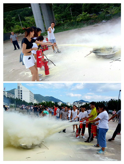 本次的演練項目是使用干粉滅火器進行實戰滅火演練。演練前,保衛處就火災事故發生時滅火方式和滅火器的使用方式進行了詳細講解。演練時,四人一組使用干粉滅火器災進行滅火撲救,完成演練的同學們在引導人員的指揮下安全離場。