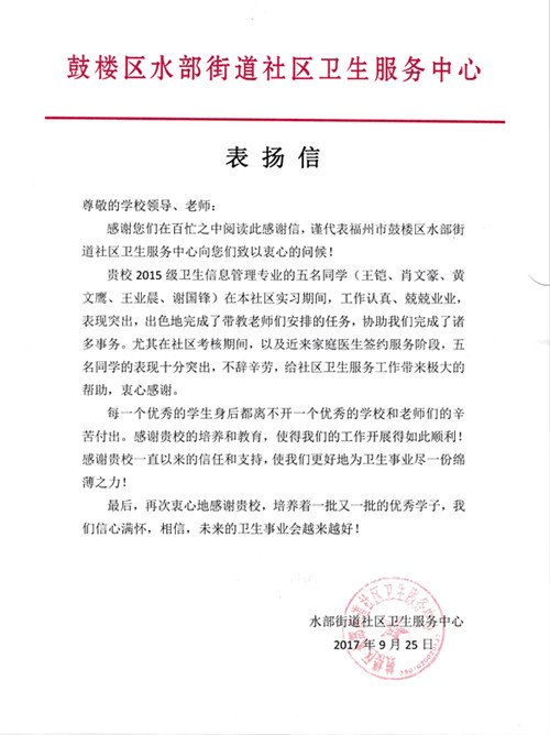 近日,管理系收到實習單位水部街道社區衛生服務中心發來的表揚信。